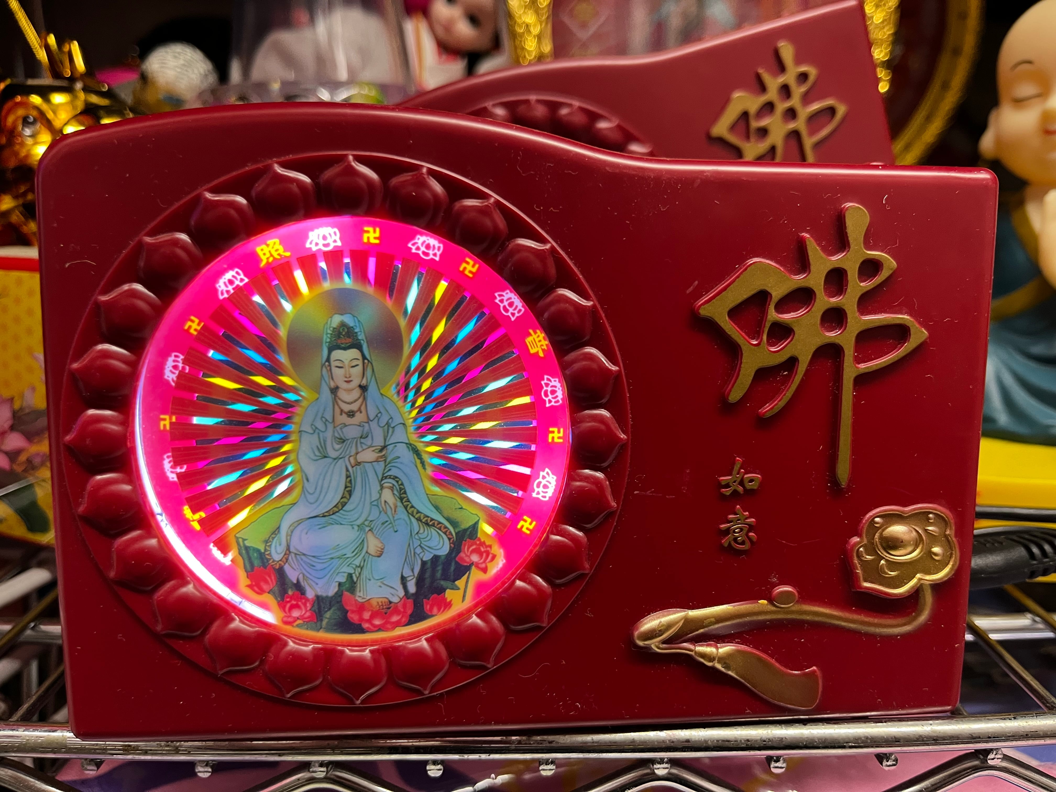 阿弥陀経で極楽へ生まれる人の心と蓮華の五徳をモチーフに右にあしらった品です。電源を入れると外周は回転し光り輝き仏様をご来光と共にお迎えできます。軽快な昭和歌謡POP調な曲や観音さまの経典、鐘の音、テクノ、合唱など様々な全62曲が収録されてますので貴方だけのお気に入りの1曲を探してみて下さい!ボタンにて曲送りをします。中国語の勉強やプレゼントにもサプライズで使えます。「南無阿弥陀仏」は インドの古代の言語であり、お経に使われたのがサンスクリット語です。イヤフォンジャックにより外部機器に接続も可能。 側面に電源とボリューム一体型ツマミ、上部に曲送り・戻し・一時停止ボタン☆中国のカルト的人気のある電子仏具。 就寝前にありがたい気持ちで夢の中へ行くのも良し、お花見や、パーティで瞑想したりサンプラーに取り込んでエフェクトを掛けたり、、、 使い方は貴方次第です!