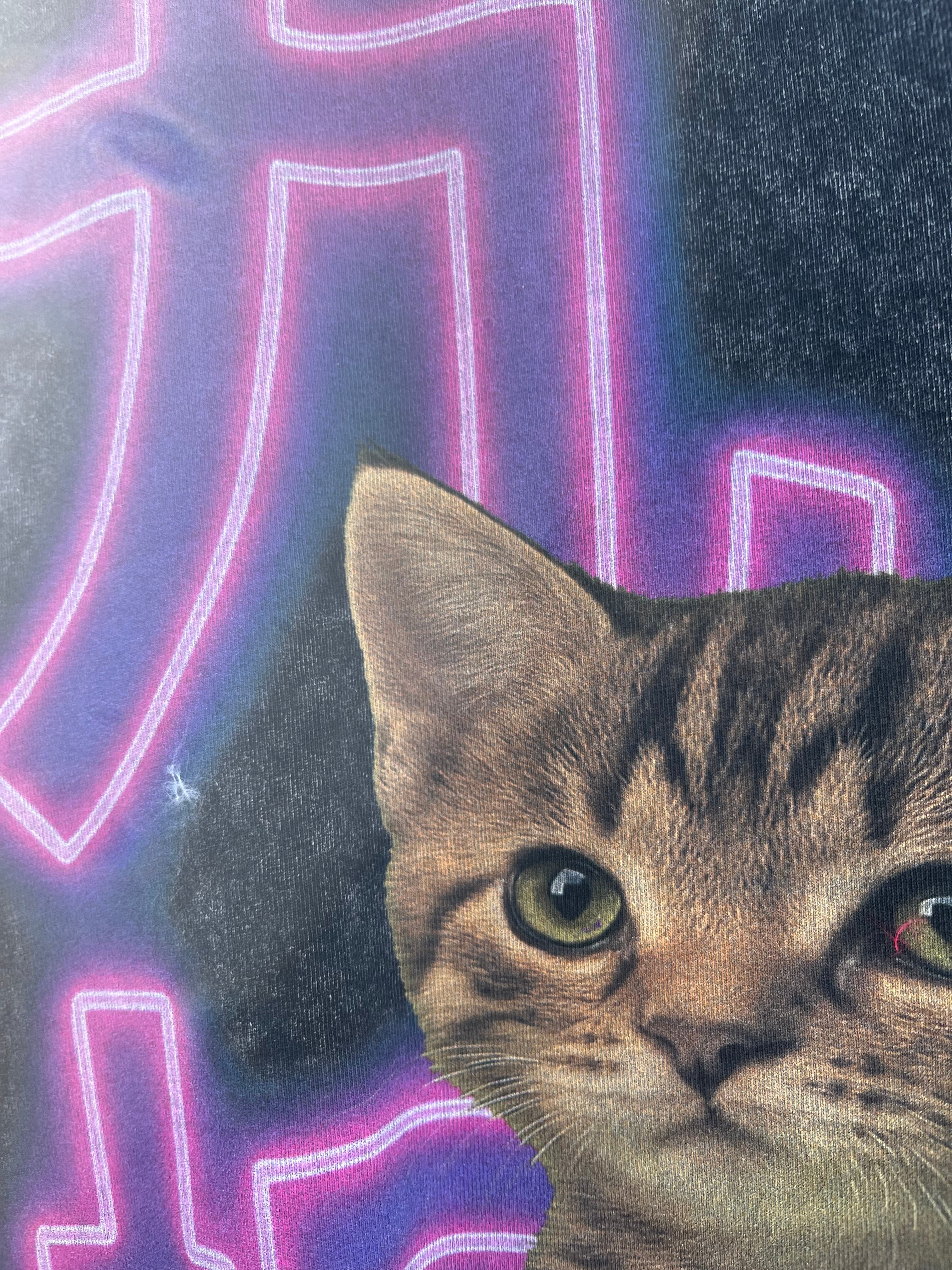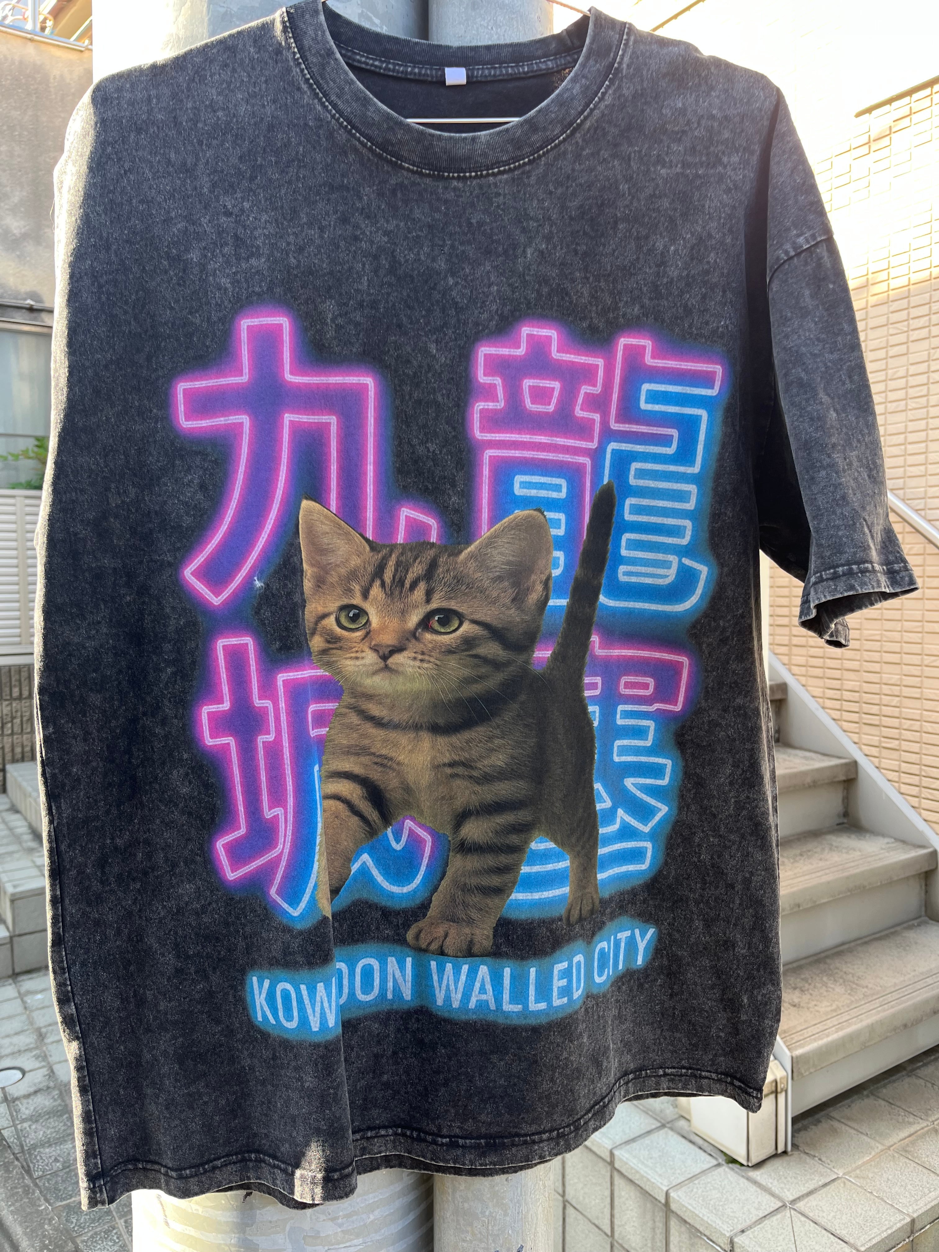 Tシャツ 香港 九龍城塞 ネオン看板 猫 ウォッシュ加工 ビッグシルエット